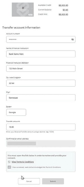 7. Fill out the information for the card you want to move the balance from. You will need the account number, transfer amount, as well as the name and address of the financial institution holding the balance.
