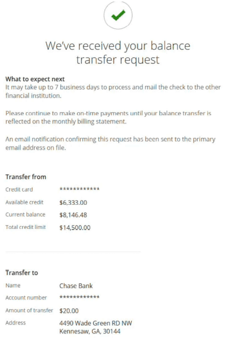 7. Fill out the information for the card you want to move the balance from. You will need the account number, name and address of the other financial institution, and the transfer amount.