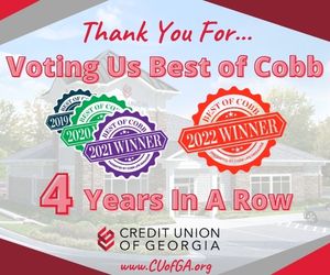 Credit Union of Georgia was nominated and named Best Credit Union in the Cobb Life / Marietta Daily Journal’s “Best of Cobb” contest. The polls opened on Christmas Eve (2021) and the votes flooded in, totaling over 400,000. Best of Cobb is an annual contest and celebration of local businesses, chosen by the MDJ and Cobb Life Magazine readers.